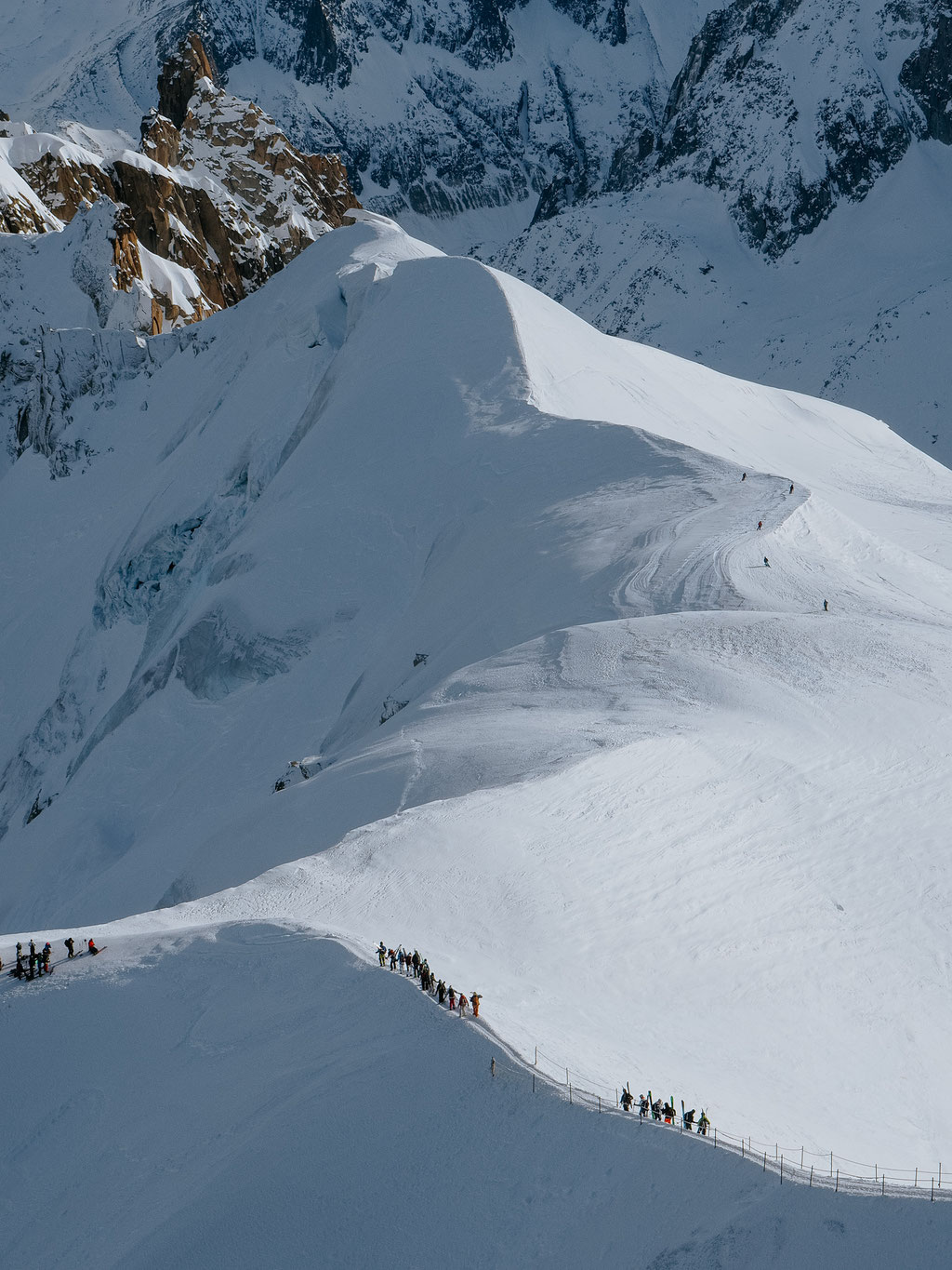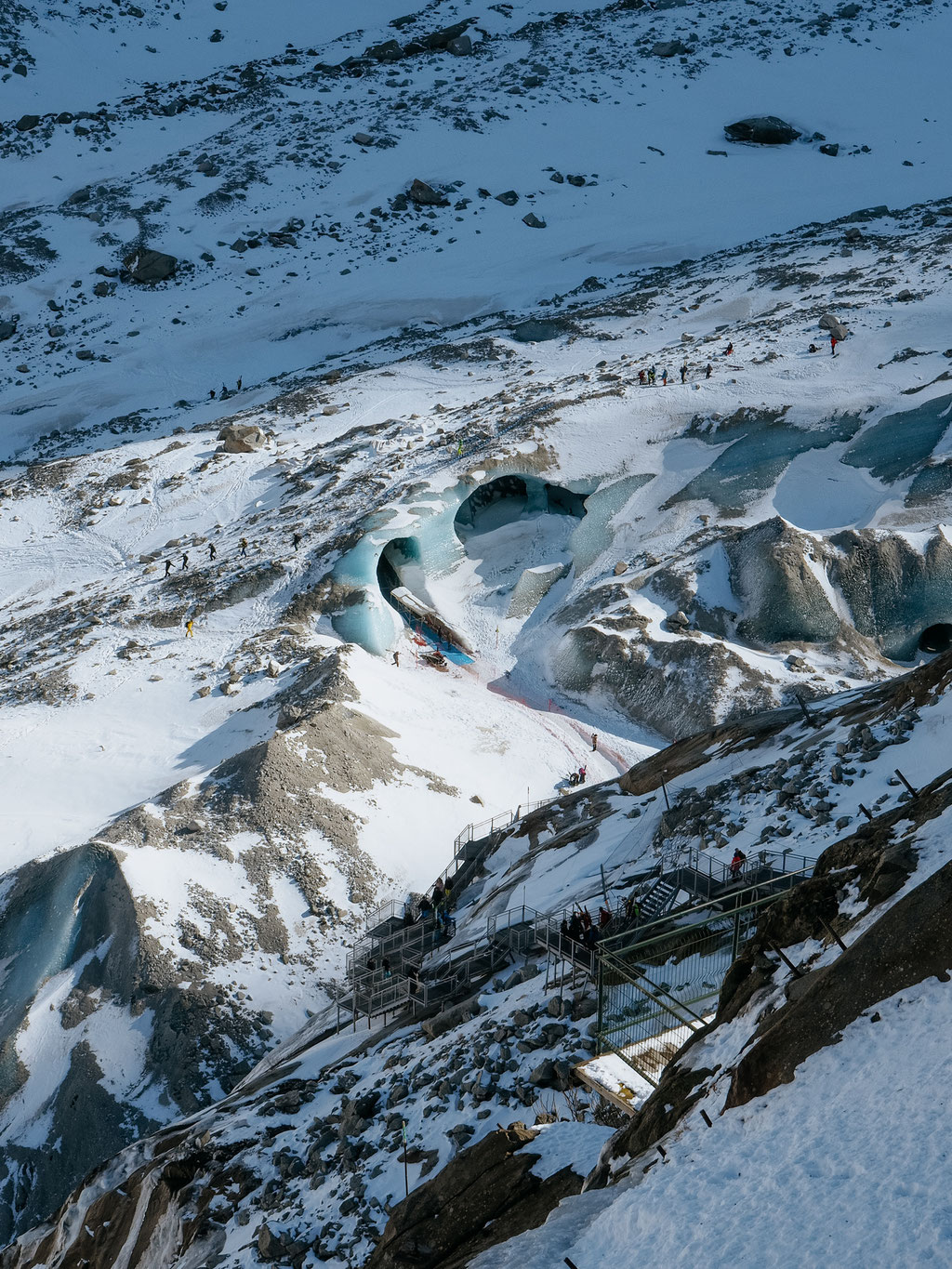 The tunnels at Aiguille du Midi were carved directly into the mountain itself, and the left path leads to the access point that mountaineers and skiers use to descend the steep and highly exposed ice ridge onto the glacier below. Be sure to check out the snow-carved passage tunnels, as they are an impressive detail not to be missed!