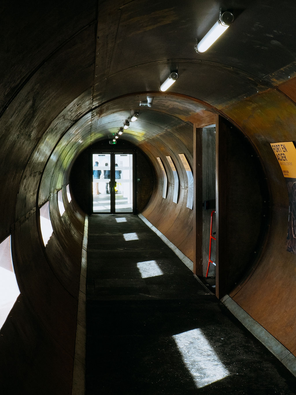 After crossing the Pipe, you'll arrive at the "Cosmiques terrace" which boasts comfortable benches and larger windows to sit and relax while admiring the stunning views of Vallée Blanche and the Cosmiques Ridge. Additionally, there's a current exhibition called the "Hypoxia level" that explains the effects of oxygen reduction in high altitudes on the human body.