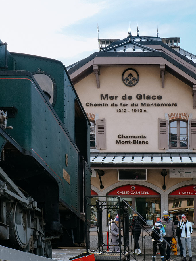 The journey to the Mer de Glace glacier begins at the Montenvers train station, situated just behind the Chamonix one. The vintage-looking red railway trains will take you on a 20-minute ascension through the forest, tunnels, and viaducts. As you ascend, you'll get occasional glimpses of the valley below, but the most magnificent sight is yet to come. Once you reach the top, at an altitude of 1,913 m (6.276 ft), the Mer de Glace glacier will unfold below you, surrounded by towering mountain peaks (you can check the Montenvers area map here).