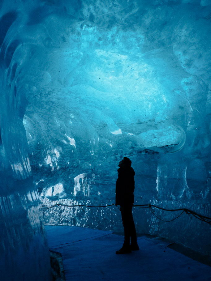 Entering the ice cave to witness its interior was an experience unlike any other we have had in our lifetime. The moment we stepped into the first gallery, we were immediately struck by the otherworldly feel of being surrounded by solid blue ice walls. As we continued on, we couldn't help but notice the various objects trapped within the ice, including rocks, leaves, and even pieces of wood that have been preserved for decades or even centuries. This family-run ice cave business, which began in 1946, is a testament to the ingenuity of humans to create unique experiences in nature. Each winter, they carve out a new cave with new features like ice sculptures, an ice bar, and even an ice throne.