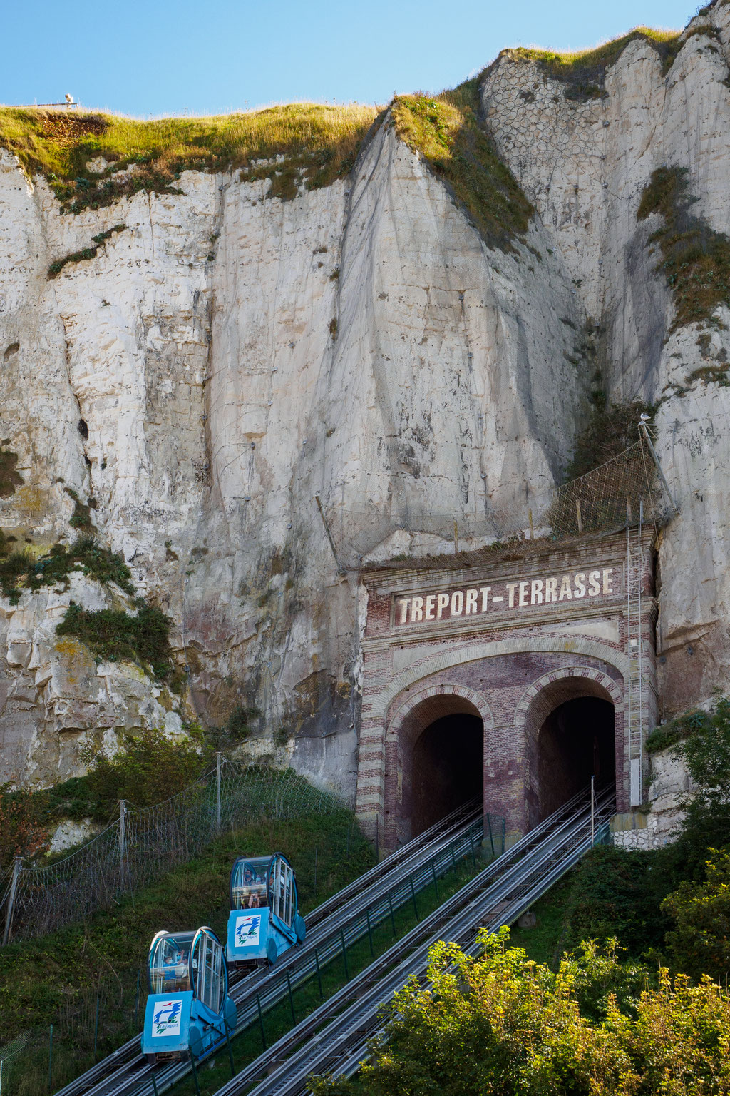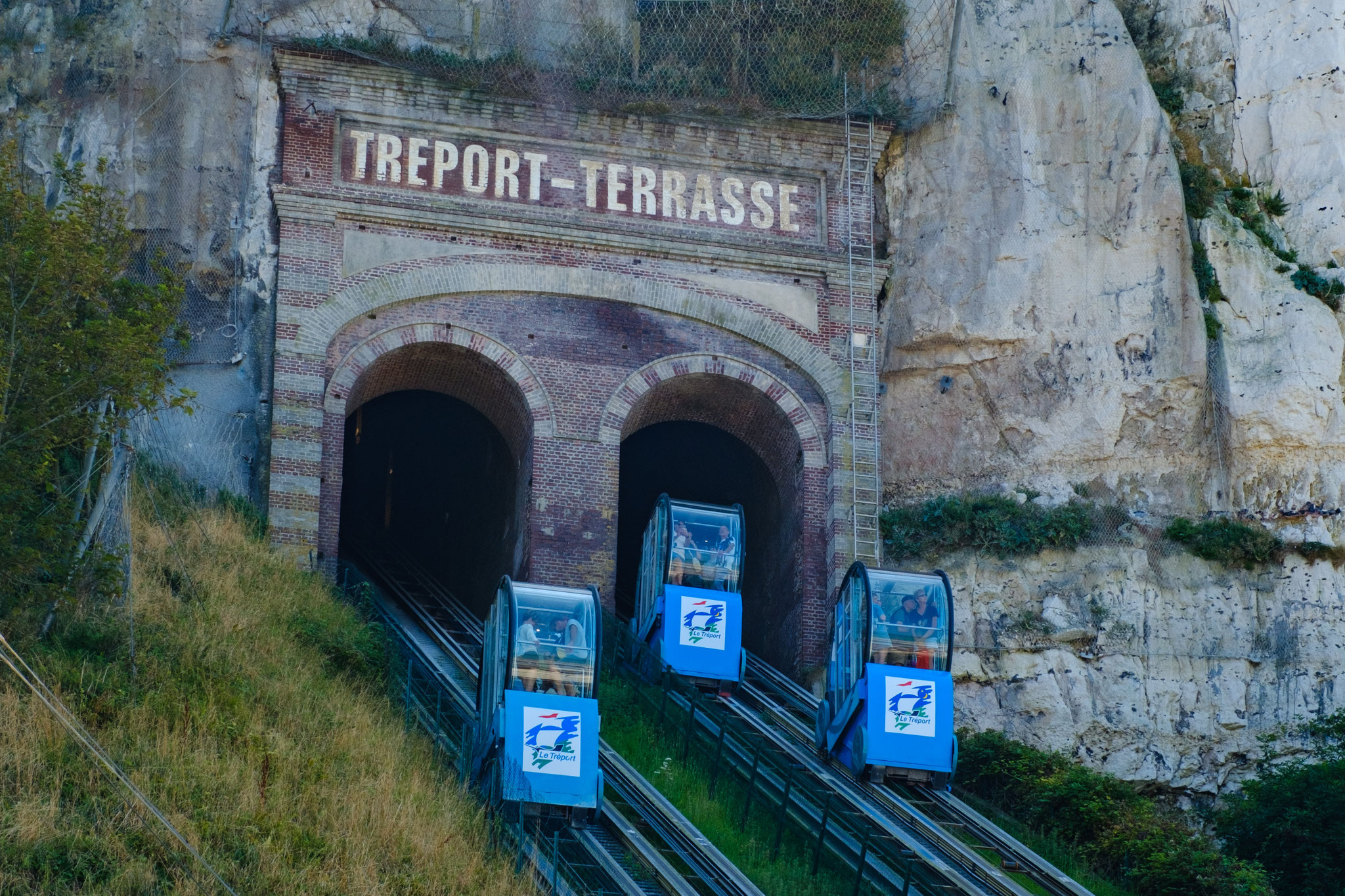 Le Tréport’s funicular connects the seaside with the cliff-top heights, providing an easy way to reach the elevated parts of town. Proposed around 1880 to support the town’s growing seaside tourism, construction began in 1907 and lasted 17 months, including two months of tunnelling. In 1908, it allowed guests of the Grand Hôtel Trianon to descend comfortably to the beach in wooden carriages, avoiding the 365-step climb down, which they would then have to make back up to the hotel. The funicular was later disrupted during World War II, briefly revived for a few seasons in the 1960s, and fully refurbished in 2006. Today, it offers stunning views of the harbour, town, and English Channel, combining practical transport with a historic experience that takes visitors to the cliff-top paths and viewpoints.