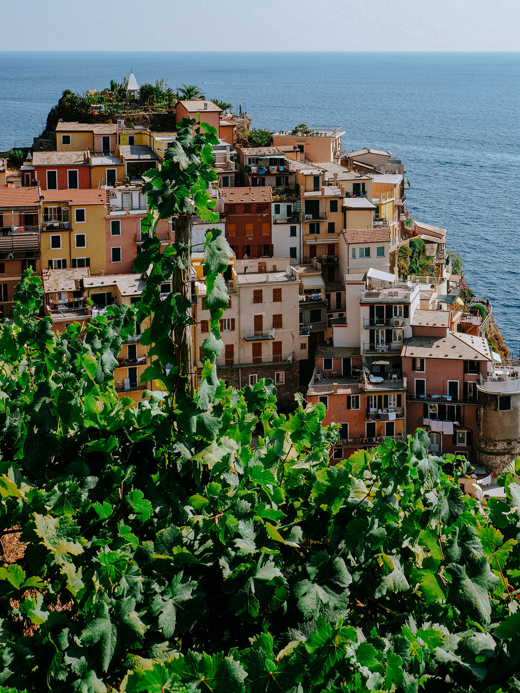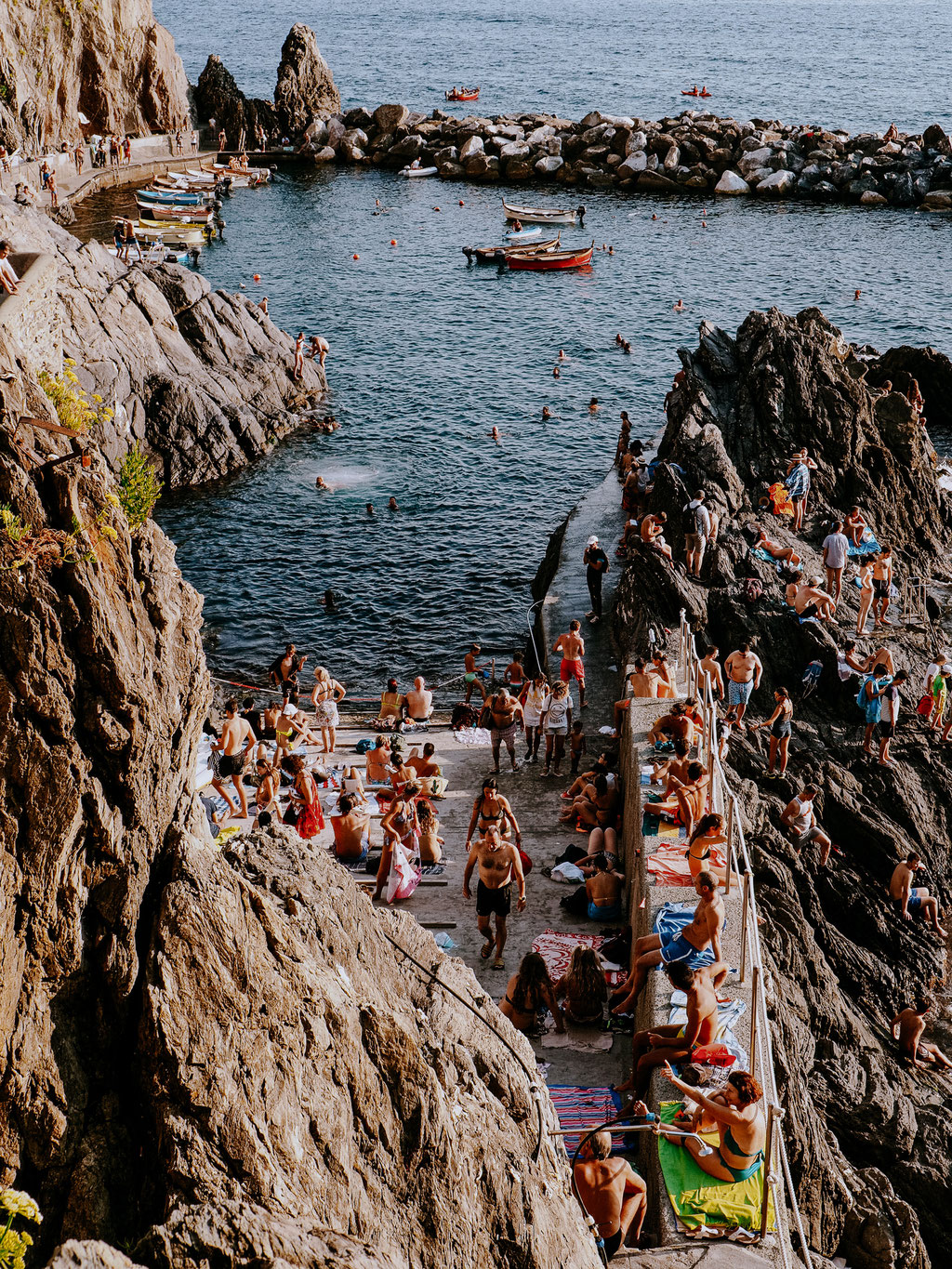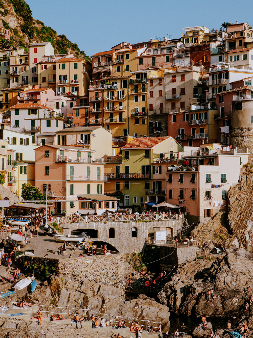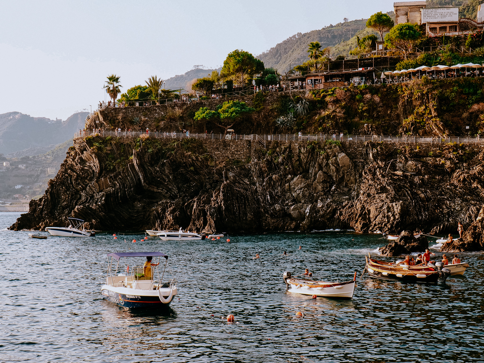 The village of Manarola developed from a ravine which starts in a rocky little harbor incredibly squeezed between two stony cliffs and was recently protected by a breakwater, allowing the water to be calm enough to establish a marina. However, here people and boats fight for their place in the magnificent blue waters. As the town doesn't offer sandy beaches, tourists huddle on the harbor rocks to enjoy the sunny weather. But how can we blame them? The view of the colored houses crammed against one another and the vineyards above encircle the marina and make this spot way more scenic than just a beach spot elsewhere.