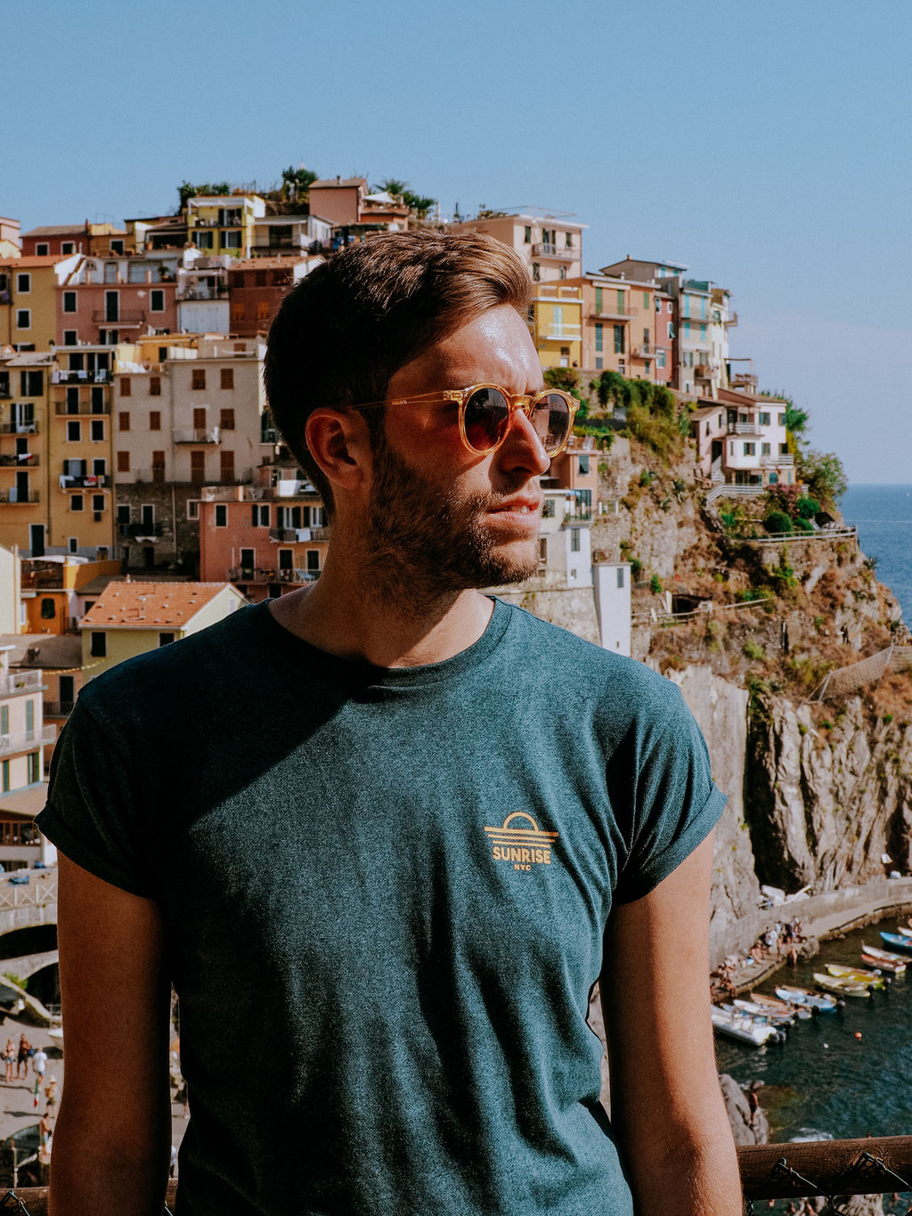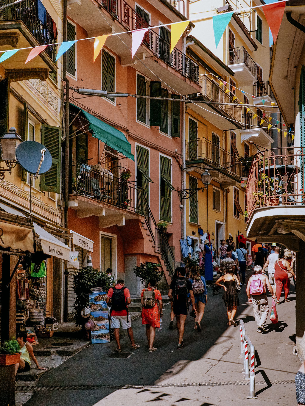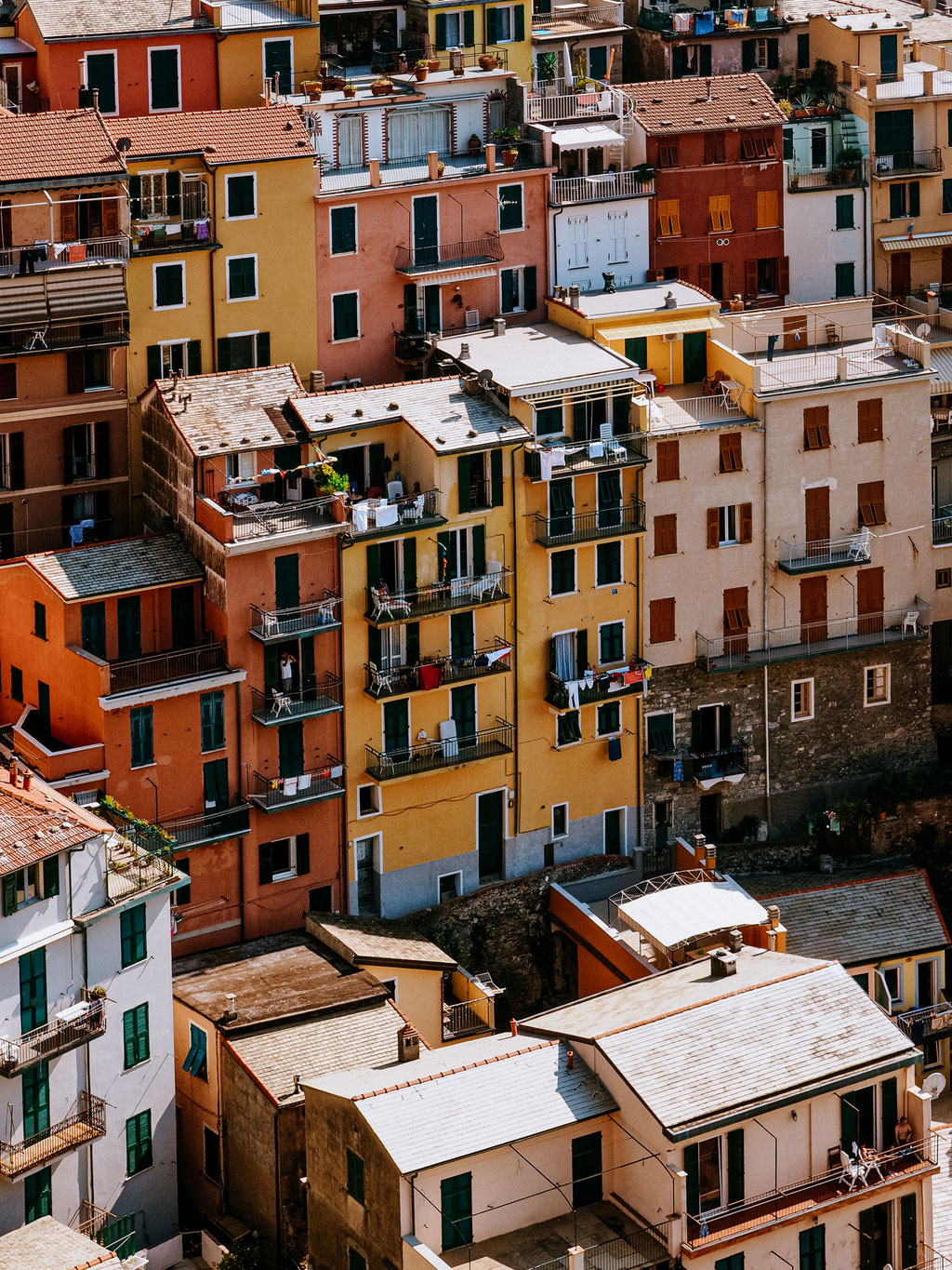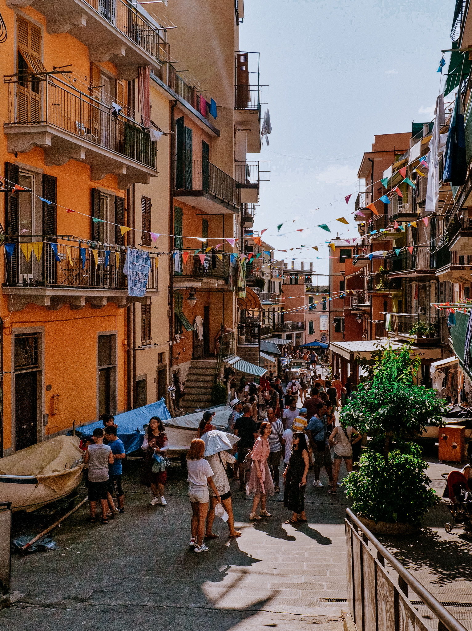 The village of Manarola developed from a ravine which starts in a rocky little harbor incredibly squeezed between two stony cliffs and was recently protected by a breakwater, allowing the water to be calm enough to establish a marina. However, here people and boats fight for their place in the magnificent blue waters. As the town doesn't offer sandy beaches, tourists huddle on the harbor rocks to enjoy the sunny weather. But how can we blame them? The view of the colored houses crammed against one another and the vineyards above encircle the marina and make this spot way more scenic than just a beach spot elsewhere.