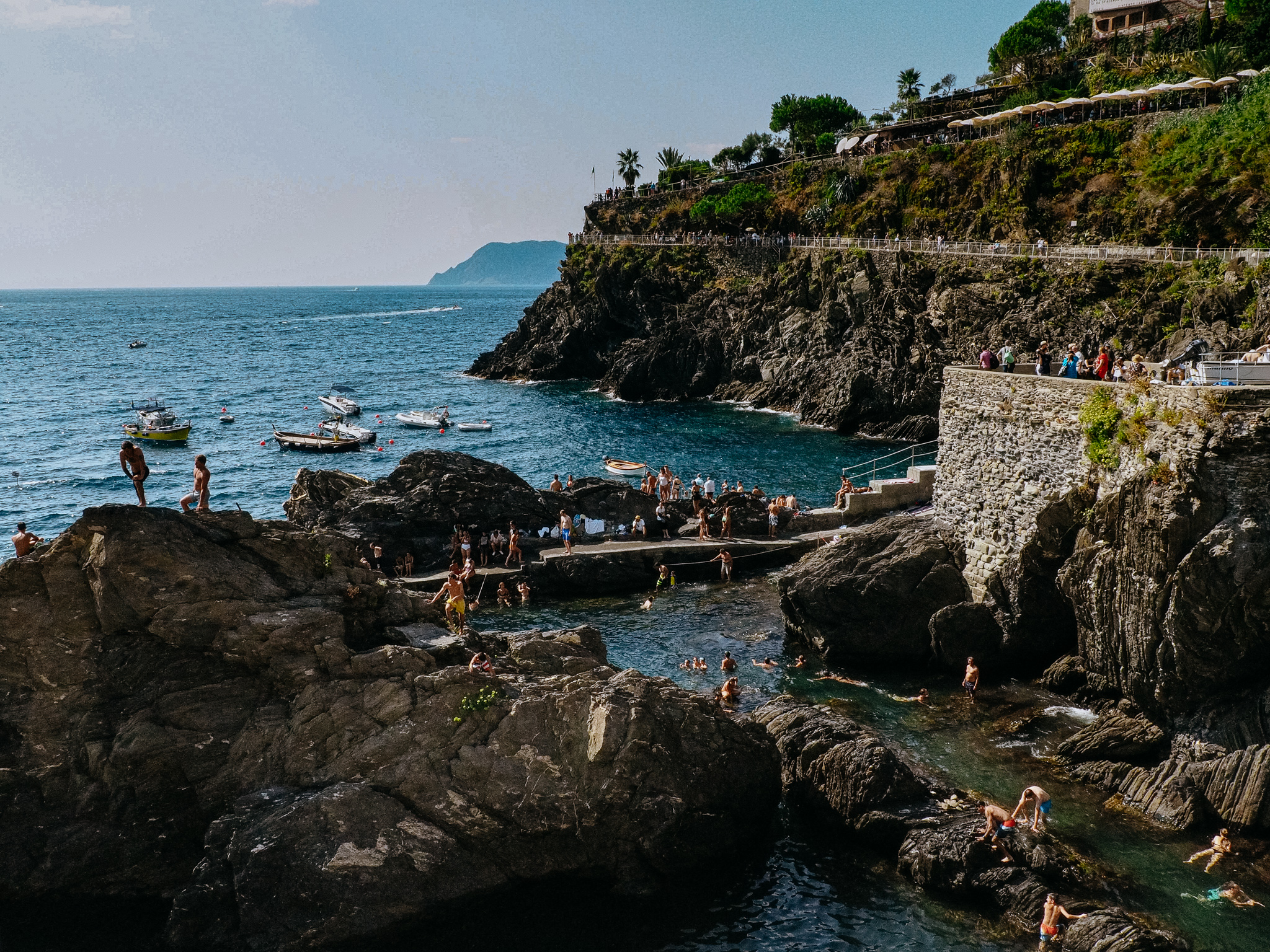 Further from the marina (where 90% of the tourists stay for sunbathing and swimming), there is a more remote swimming point worth checking if you're into a little adventure! Following the Via del Giovanni path which encircles the Punta Bonfiglio, you will find a couple of rocks just before the path taking to Corniglia where you can leave your stuff for a refreshing dip. Although not a big one, this swimming spot offers pristine water with a view to Corniglia and the other villages north of Manarola.